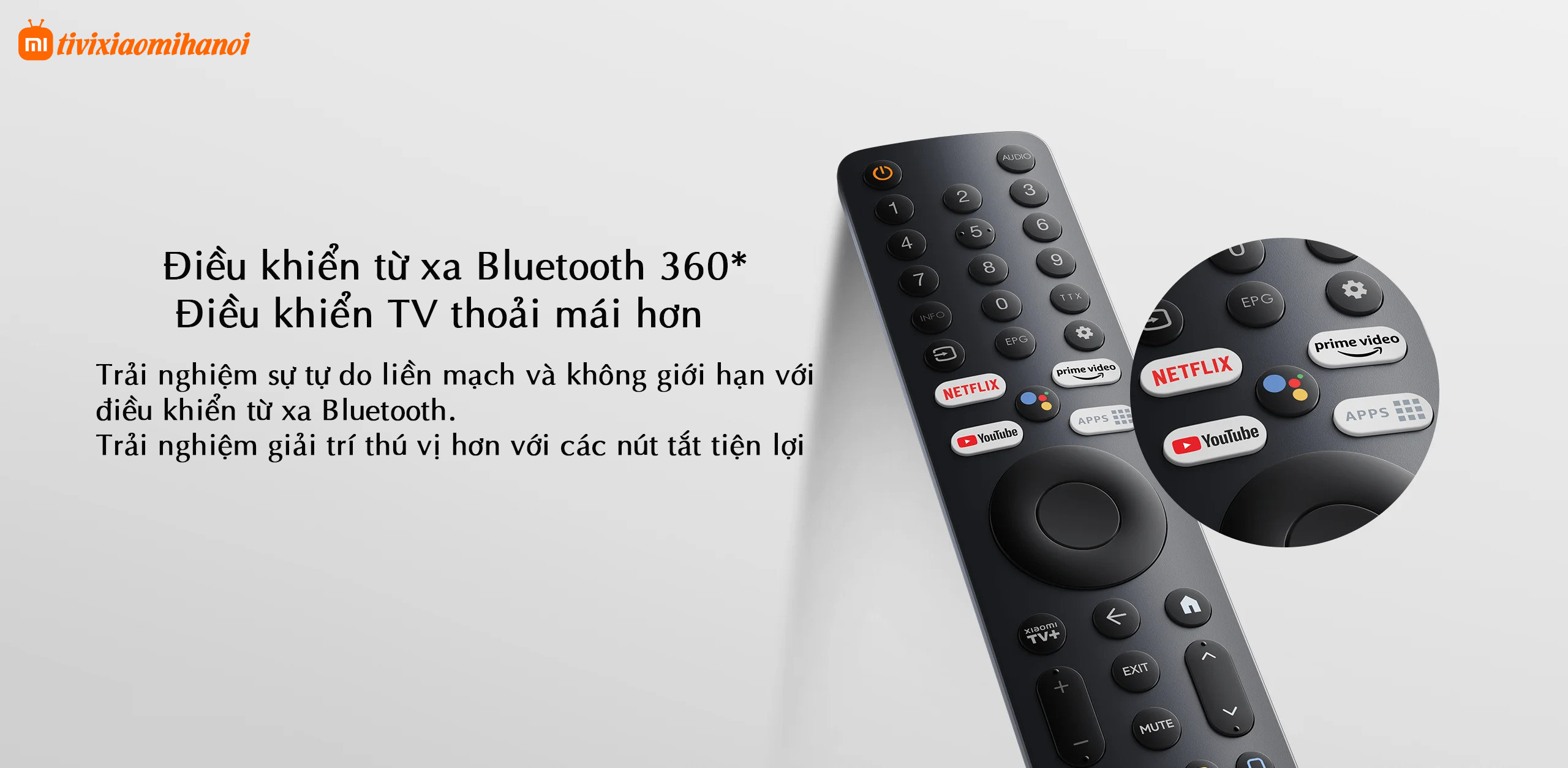 Dễ dàng điều khiển chiếc TV thông minh của bạn bằng điều khiển từ xa Bluetooth 360°. Thay vì phải hướng điều khiển vào Tivi như điều khiển hồng ngoại thì giờ đây bạn có thể dễ dàng điều khiển chiếc tivi của mình ở bất kì nơi đâu , chỉ cần trong phạm vi Bluetooth.