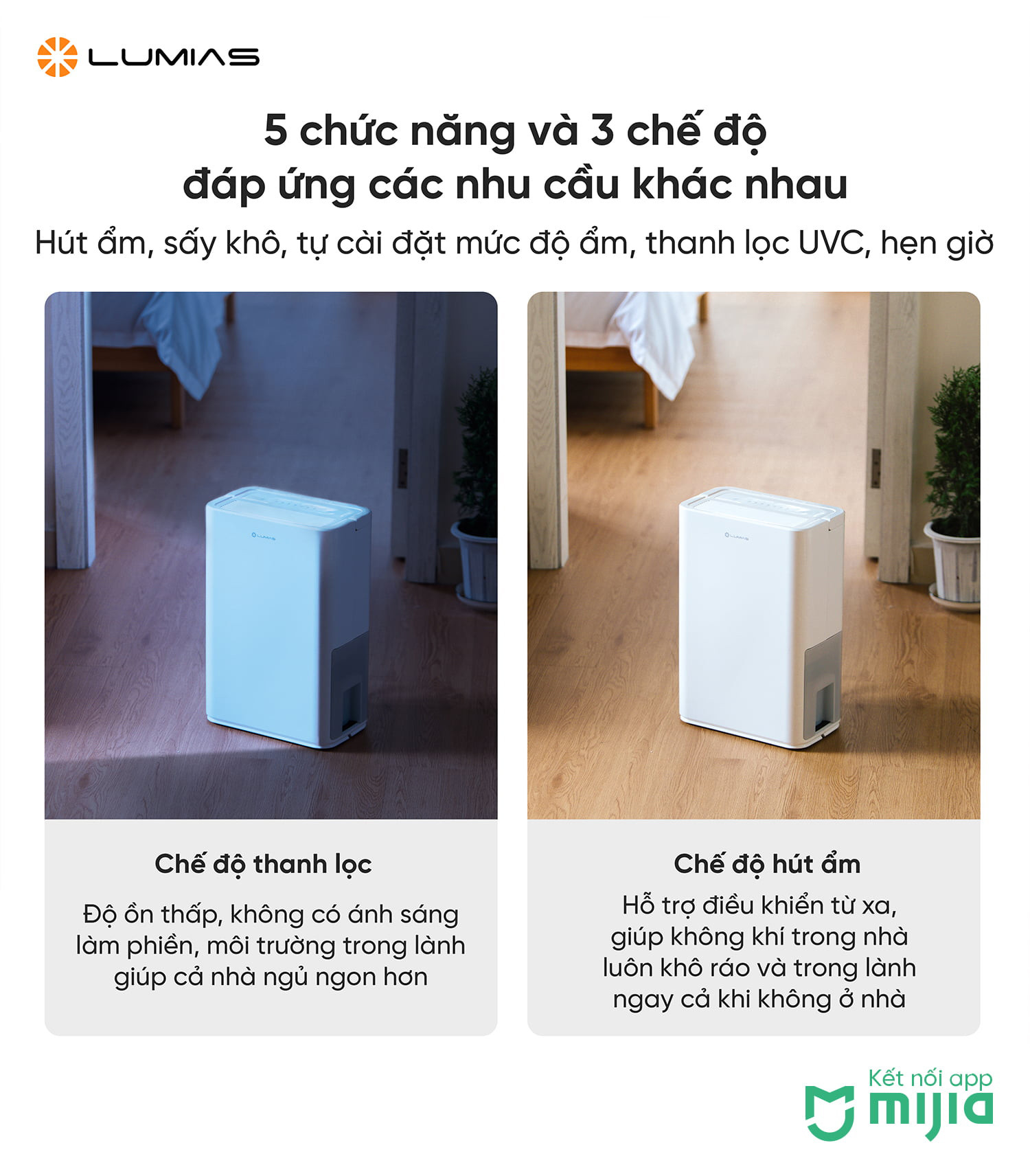 Máy hút ẩm Lumias D2 tích hợp 5 chức năng thông minh: hút ẩm, sấy khô, cài đặt mức độ ẩm tự động, thanh lọc UVC và hẹn giờ, đáp ứng mọi nhu cầu sử dụng của người dùng.