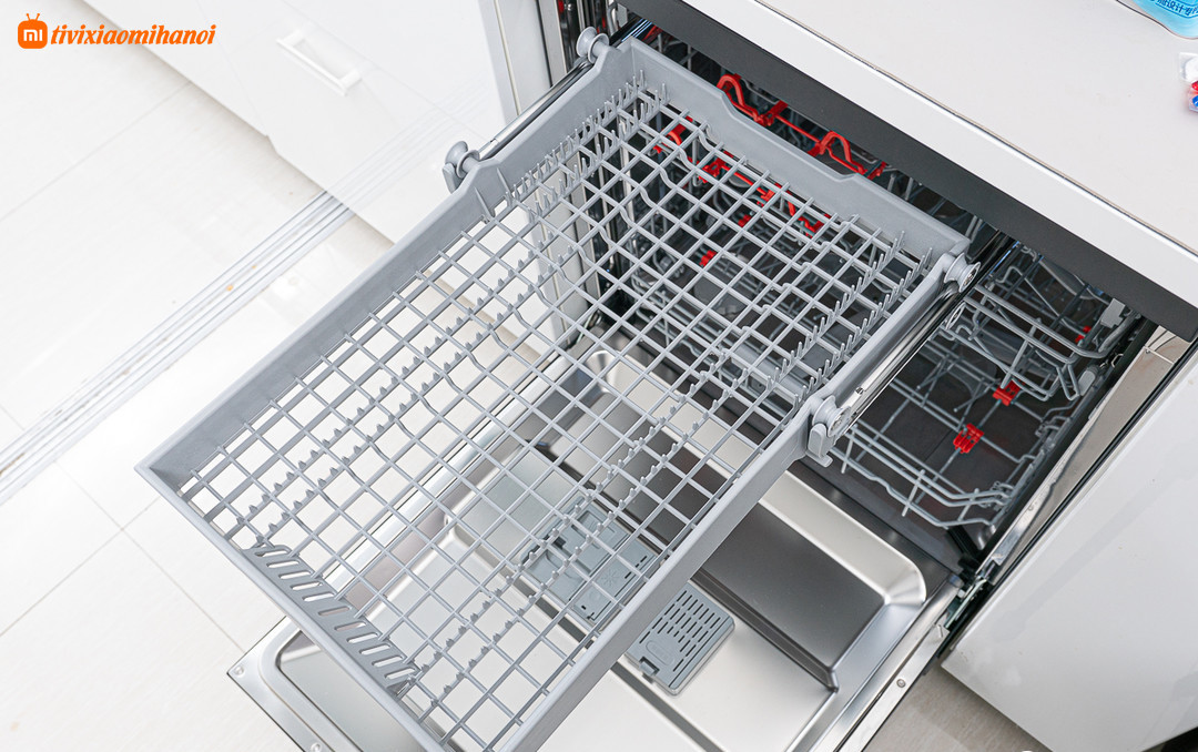 Máy được chia làm 3 tầng riêng biệt. Giỏ trên cùng được thiết kế chuyên dụng để vệ sinh các dụng cụ nhà bếp nhỏ như thìa, đũa, dao, dĩa,…Giỏ tiếp theo của máy rửa bát được làm bằng thép không gỉ cao cấp, có thể nâng lên hạ xuống dễ dàng để bạn sắp xếp bát đĩa một cách linh hoạt. Giỏ dưới cùng, với thiết kế rộng rãi và khả năng chứa đồ đa dạng, giúp bạn dễ dàng rửa sạch các loại nồi, chảo lớn có tay cầm dài 24cm và đường kính đáy 34cm. Với hệ thống vòi phun 360 độ và cảm biến tự động điều chỉnh lượng nước, máy đảm bảo rửa sạch mọi vết bẩn cứng đầu, giúp bạn tiết kiệm thời gian và công sức.