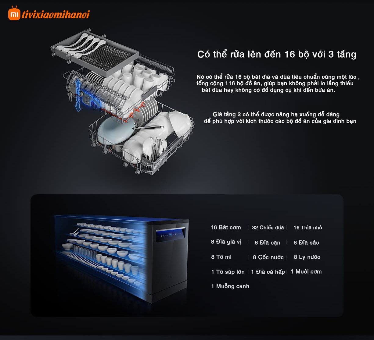 - Dung tích lớn 16 bộ bát đĩa cùng tính năng rửa phân tầng