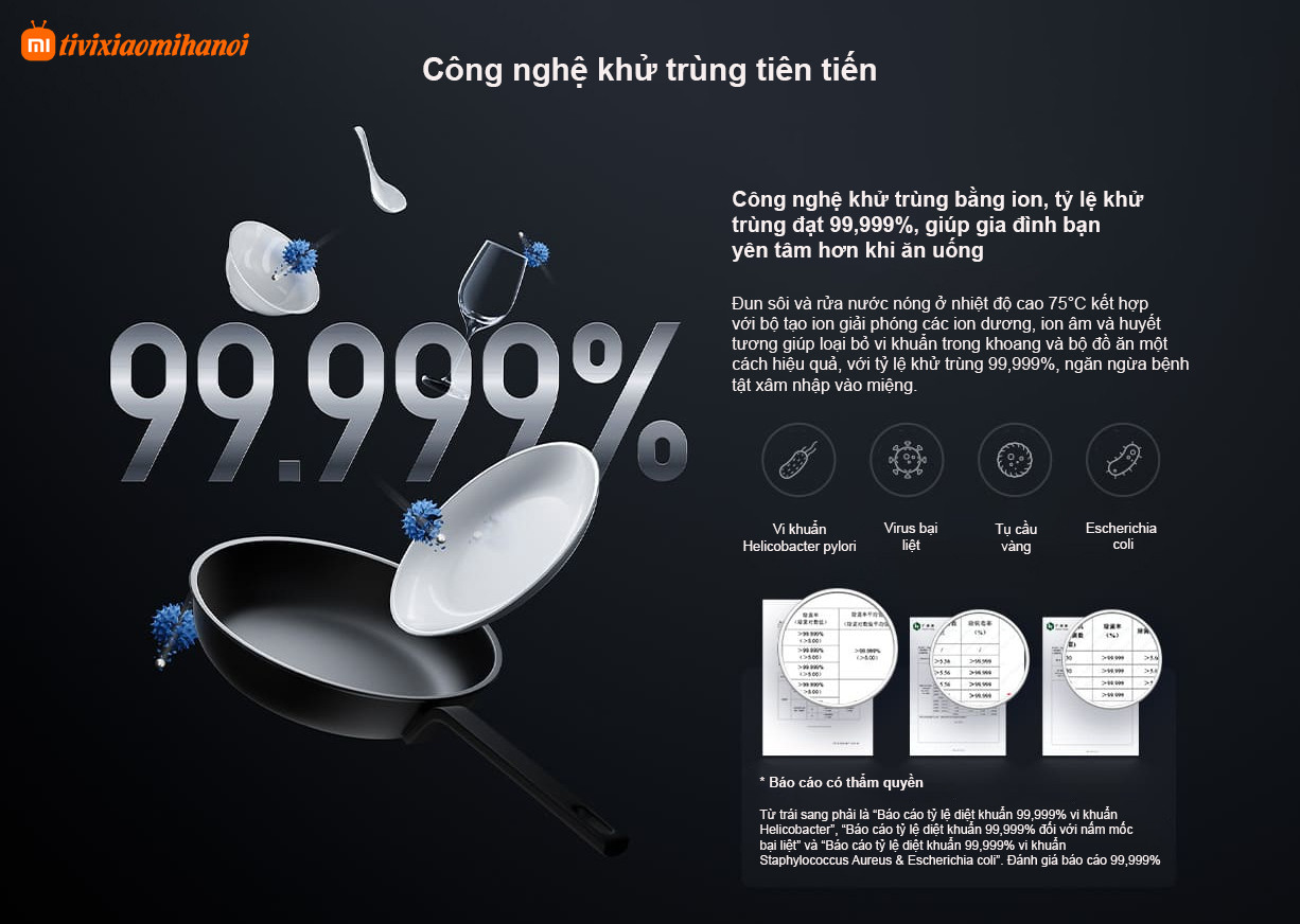 Công nghệ khử trùng Ion giúp cho tỉ lệ tiệt trùng đạt 99,999% . Đun sôi và rửa ở nhiệt độ cao 75 độ C kết hợp với bộ tạo giải phóng các ion dương, ion âm và huyết tương giúp loại bỏ vi khuẩn trong khoang , trên bộ đồ ăn một cách hiệu quả, ngăn ngừa bệnh tật xâm nhập vào miệng