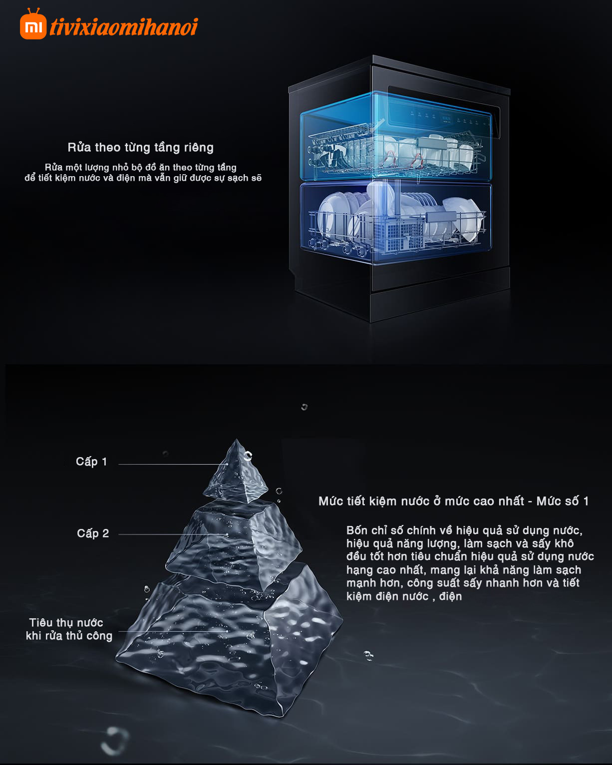 Ngoài ra trong trường hợp có quá ít bát đĩa để rửa thì bạn cũng không cần lo lắng, bởi Mijia P1 có thể thực hiện rửa ở tầng trên hoặc tầng dưới riêng giúp tiết kiệm điện nước và bạn cũng không cần tích trữ bát đĩa để rửa, cực kỳ tiện lợi.