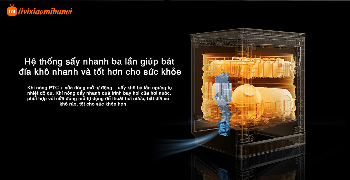 Máy rửa bát Xiaomi Mijia 16 bộ N1 được trang bị khí nóng PTC + cửa mở tự động + hệ thống sấy khô ba lần ngưng tụ nhiệt độ dư. Không khí nóng làm tăng tốc độ bay hơi của hơi nước, đồng thời phối hợp với việc đóng mở cửa tự động để giải phóng hơi nước, giúp bát đĩa được khô lâu và tốt cho sức khỏe hơn.