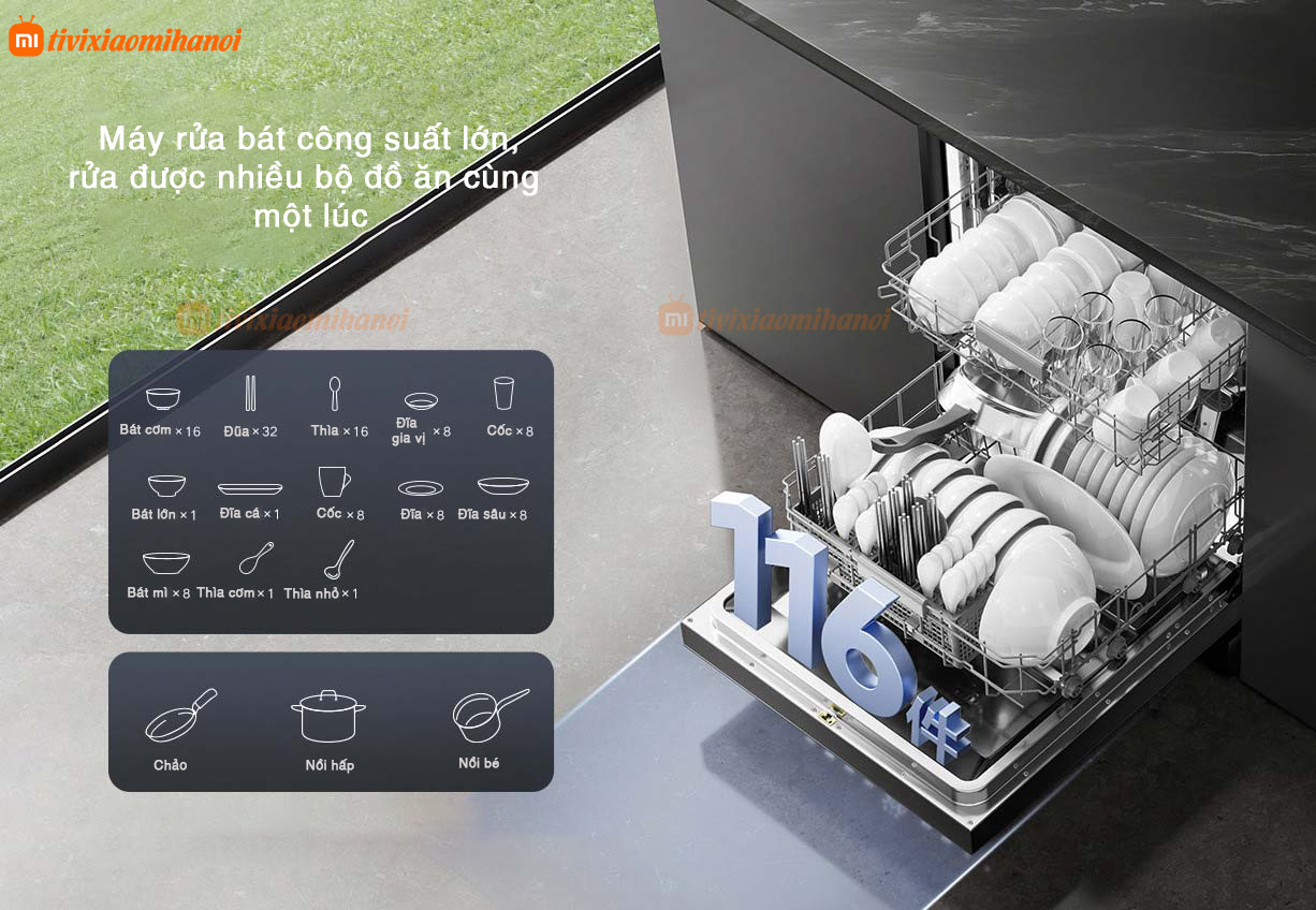 Máy rửa bát Xiaomi Mijia 16 bộ N1 áp dụng phương pháp lắp đặt độc lập và sử dụng kép, có nghĩa là nó có thể dễ dàng điều chỉnh cho dù đó là nhà mới hay nhà cũ. Kích thước nhỏ gọn của nó (dài 598mm; rộng 573mm; cao 805mm) đảm bảo lắp đặt dễ dàng trong không gian hạn chế mà không chiếm quá nhiều không gian. Máy rửa chén này có công suất lớn 16 bộ và có thể rửa 116 bộ đồ ăn cùng một lúc, phù hợp với những gia đình có đông người.