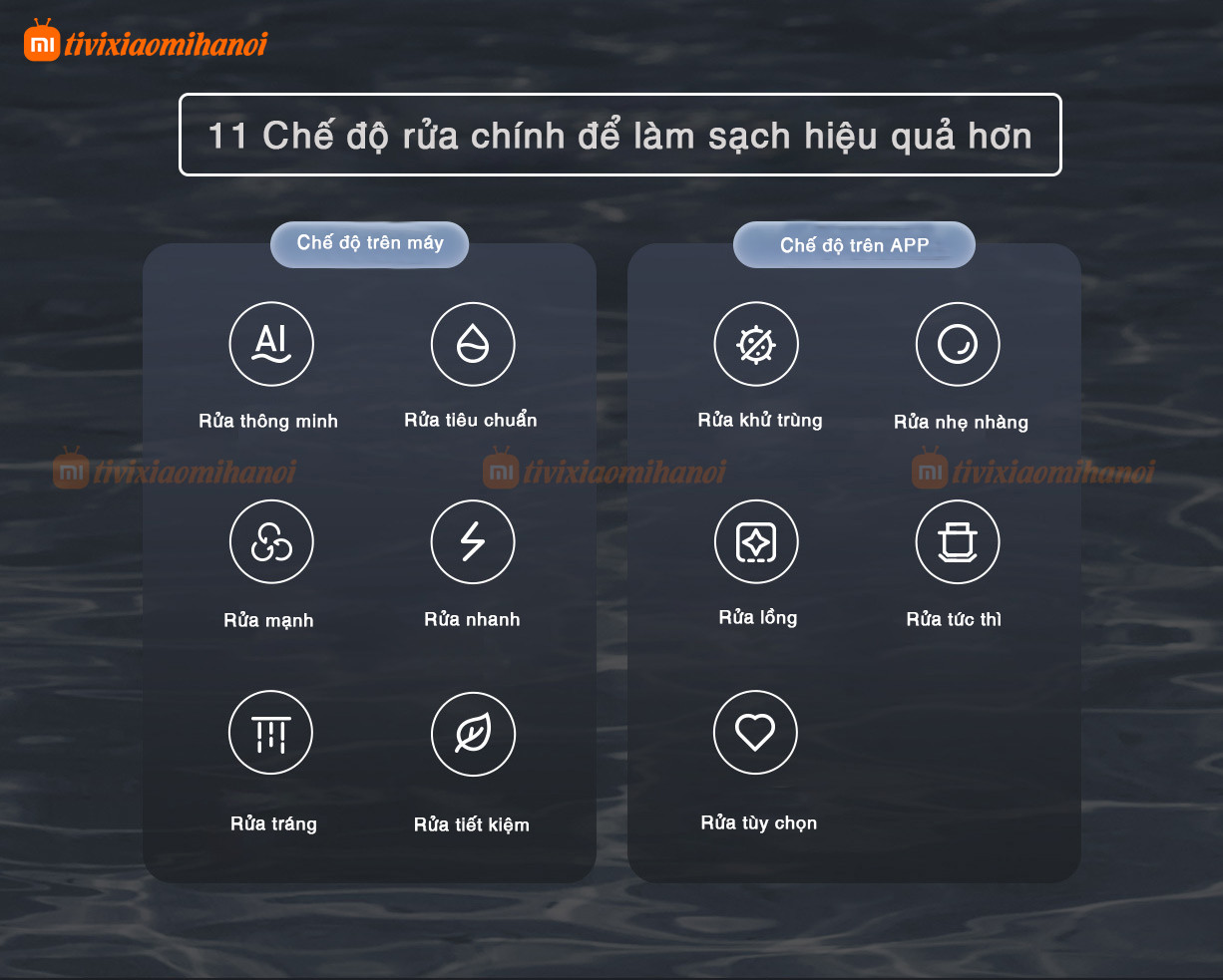 Được trang bị 11 chương trình rửa, bao gồm: rửa thông minh, rửa tiêu chuẩn, rửa mạnh, rửa nhanh, , v.v. Vệ sinh chuyên nghiệp hơn, rửa sạch hơn. Máy rửa bát Xiaomi Mijia 16 bộ N1 có thể chọn chế độ rửa phù hợp nhất tùy theo bộ đồ ăn và mức độ vết bẩn khác nhau. Áp lực nước rửa lên tới 43000Pa đảm bảo có thể loại bỏ hoàn toàn những vết bẩn cứng đầu nhất.