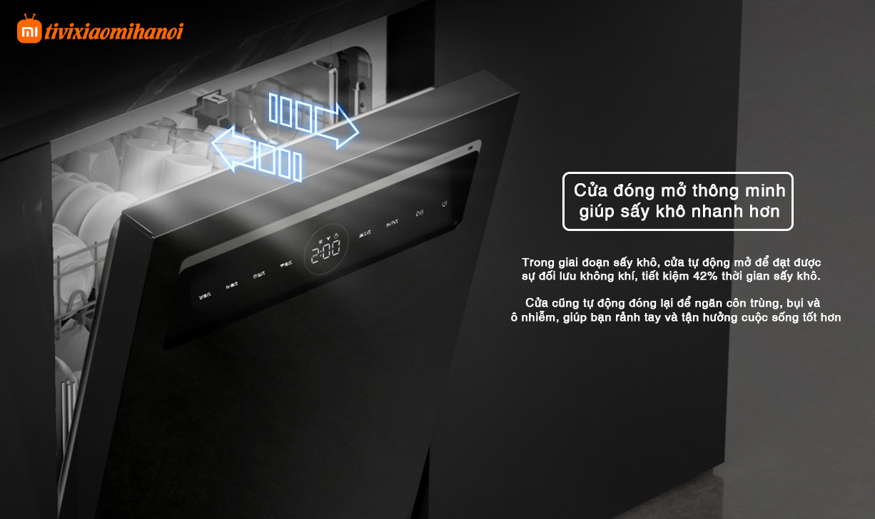 Trong giai đoạn sấy khô, máy rửa bát này sẽ tự động mở cửa để hơi nóng bên trong thoát ra ngoài, từ đó tăng tốc độ sấy lên 42%. Một số người lo lắng rằng sẽ không tốt nếu cửa mở, nhưng không cần phải lo lắng. Vì còn có chức năng đóng tự động nên có thể dễ dàng ngăn chặn côn trùng, bụi bẩn và ô nhiễm thứ cấp.