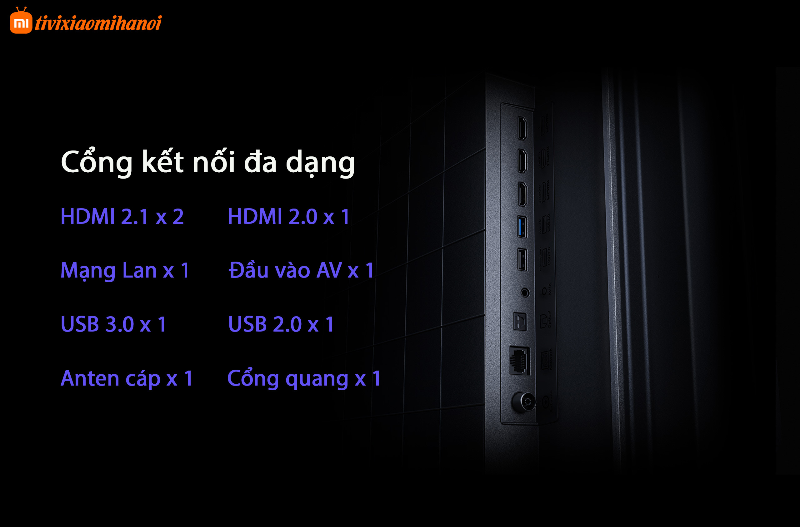 Tivi Xiaomi S65 Mini LED này sử dụng chuẩn không dây WiFi 6 thế hệ mới, giúp cải thiện đáng kể tốc độ truyền dữ liệu và đảm bảo phát lại nội dung trực tuyến một cách mượt mà. Nó cũng được trang bị giao diện HDMI2.1 kép với độ trễ đầu vào thấp tới 4ms, đặc biệt phù hợp với người chơi thể thao điện tử. Tốc độ làm mới biến đổi VRR và CHẾ ĐỘ TRÒ CHƠI nâng cao trải nghiệm trong các tình huống chơi game. Cổng kết nối gồm HDMI 2.1 x 2 cổng, HDMI 2.0 x 1 cổng, USB 3.0 x 1 cổng , USB 2.0 x 1 cổng, 1 cổng Anten kết nối với truyền hình cáp, 1 cổng quang kết nối âm thanh , 1 cổng cắm mạng Lan, 1 cổng âm thanh AV, đáp ứng nhu cầu của nhiều thiết bị bên ngoài khác nhau.