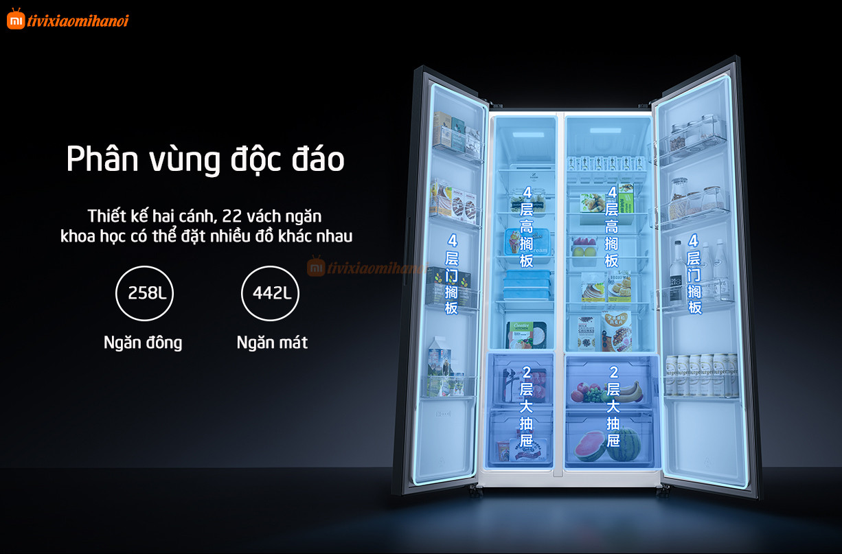 Một trong những điều kiện quan trọng nhất khi mua tủ lạnh là dung tích, thông thường chỉ cần điều kiện không gian cho phép thì tủ lạnh có dung tích lớn hơn có thể bảo quản được nhiều thực phẩm hơn, đỡ phải mua hàng thường xuyên. Tủ lạnh Xiaomi Mijia Max 700L không chỉ có dung tích lớn 700L mà còn có 22 ngăn đáp ứng nhu cầu phân vùng lưu trữ của người dùng. Đồng thời, nó áp dụng thiết kế kệ cửa có sức chứa lớn để cải thiện việc sử dụng không gian của thân cửa. Các ngăn trong tủ lạnh hỗ trợ xếp thành hai hàng, có thể đựng đồ uống đóng lon hai hàng, thiết kế khoét sâu để không bị lãng phí không gian cửa tủ lạnh.
