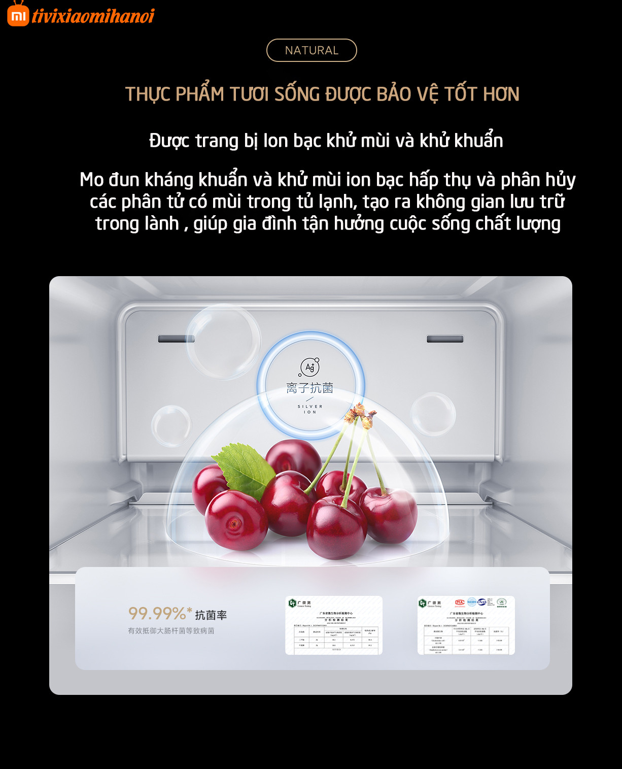 Không chỉ có hình thức đẹp mà sức mạnh cốt lõi của Tủ lạnh Xiaomi Mijia Max 700L cũng không thể xem thường. Máy được trang bị module kháng khuẩn và khử mùi ion bạc, có khả năng hấp thụ hiệu quả các phân tử mùi trong tủ lạnh, tỷ lệ kháng khuẩn là 99,99%, tạo không gian trong lành trong tủ lạnh, bảo vệ sức khỏe và sự an toàn của gia đình. Nó cũng áp dụng công nghệ không đóng băng làm mát bằng không khí, loại bỏ rắc rối của việc xả tuyết thủ công cho người dùng.
