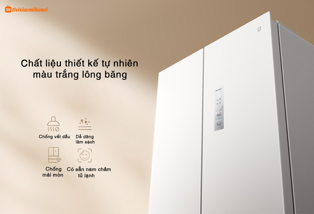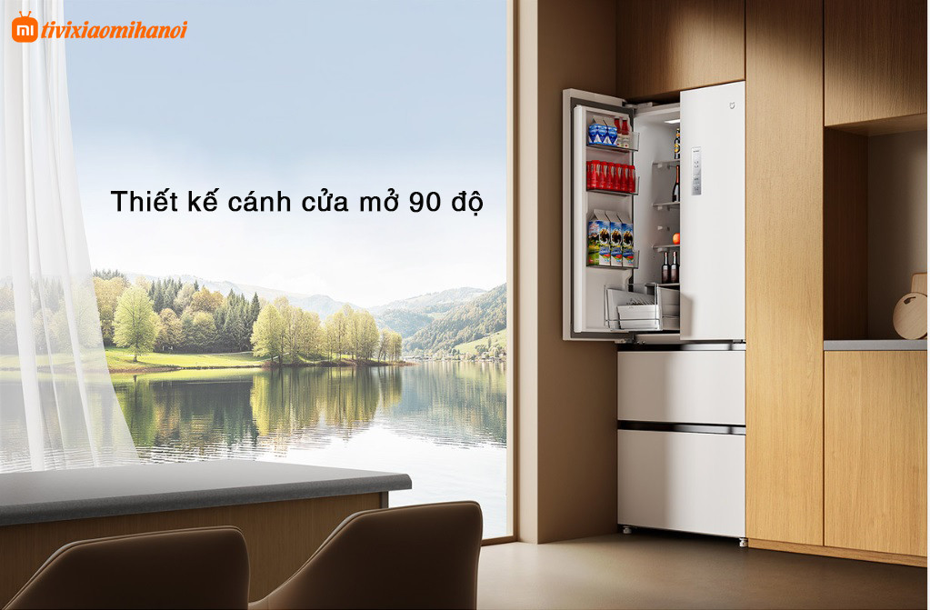 Trước hết, thiết kế bề ngoài của Tủ lạnh Xiaomi Mijia 439L kiểu Pháp rất sang trọng. Vẻ ngoài màu trắng băng không chỉ sang trọng, đẹp mắt mà còn có thể kết hợp với cách bố trí tủ hiện đại để tạo nên một không gian tổng thể hài hòa. Thiết kế phẳng siêu mỏng 60cm cho phép chiếc tủ lạnh này dễ dàng tích hợp vào nhiều kiểu bố trí nhà bếp khác nhau, tạo nên một không gian gia đình thoải mái và dễ chịu cho bạn. Ngoài ra tủ có thiết kế mở cửa góc vuông 90 độ, dễ dàng đặt tại các vị trí hẹp,không có độ hở hai bên.