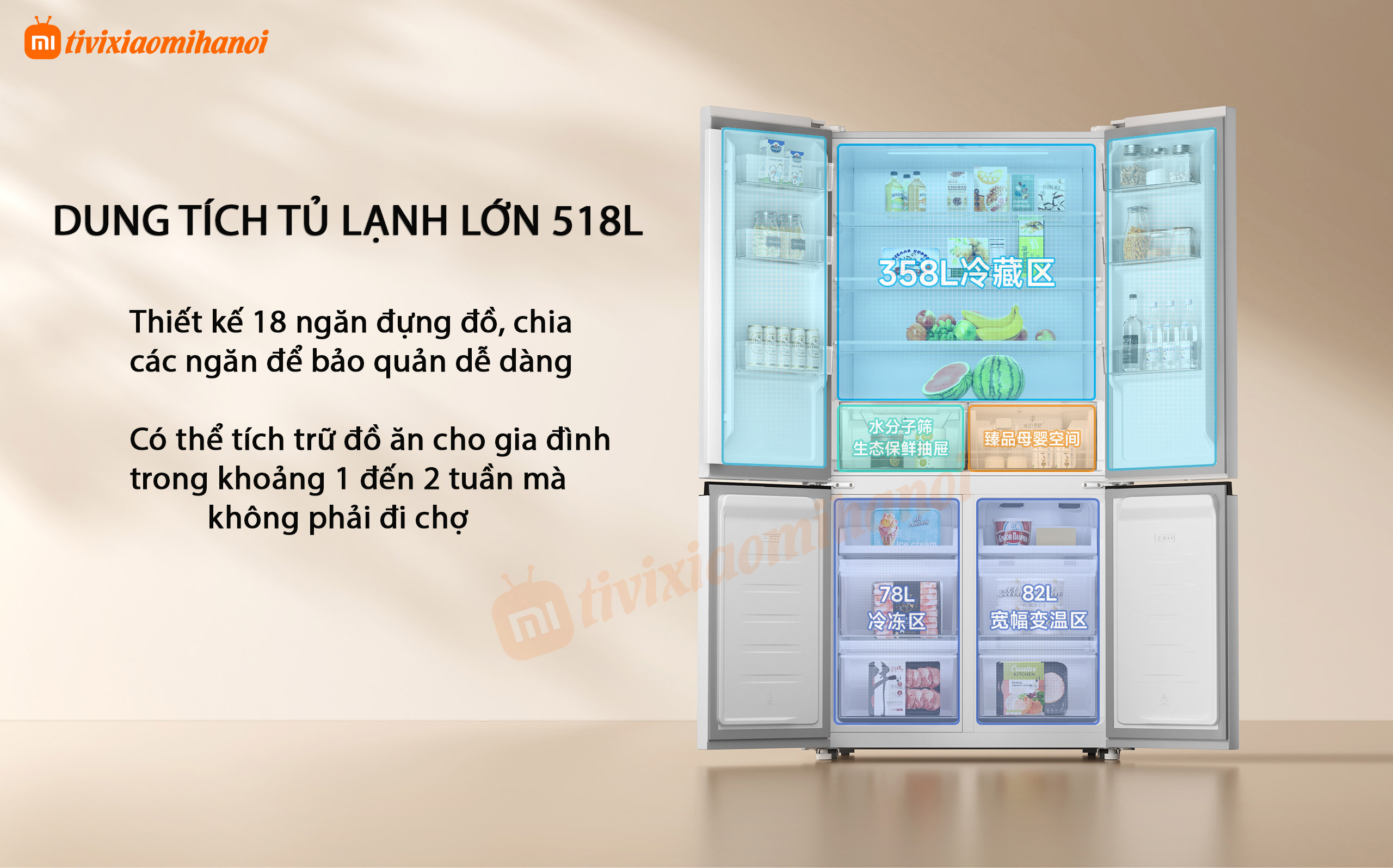 Tủ lạnh Xiaomi 518L có dung tích lớn