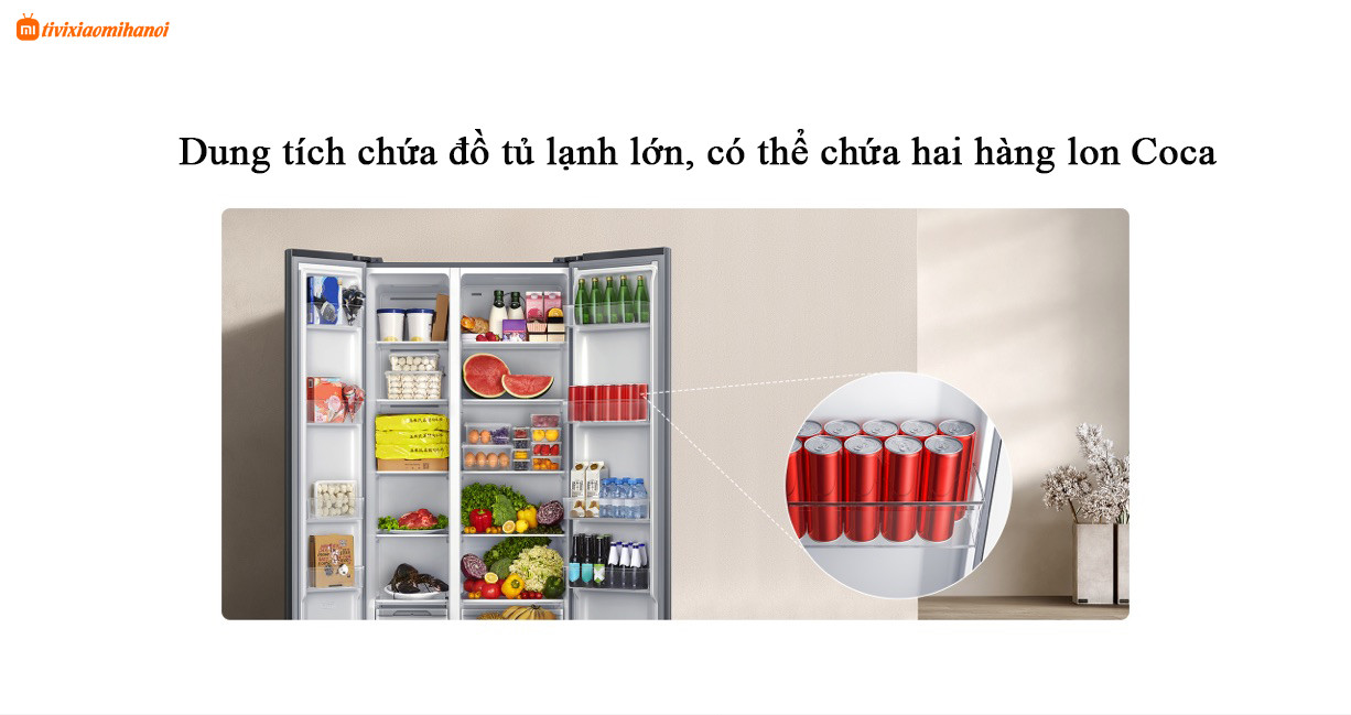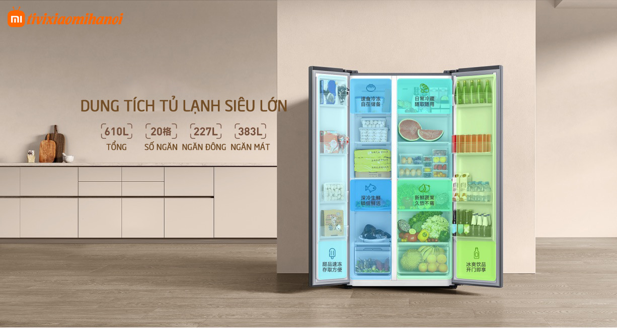 Một trong những điều kiện quan trọng nhất khi mua tủ lạnh là dung tích, thông thường chỉ cần điều kiện không gian cho phép thì tủ lạnh có dung tích lớn hơn có thể bảo quản được nhiều thực phẩm hơn, đỡ phải mua hàng thường xuyên. Tủ lạnh Xiaomi Mijia 610L không chỉ có dung tích lớn 610L mà còn có 20 ngăn đáp ứng nhu cầu phân vùng lưu trữ của người dùng. Đồng thời, nó áp dụng thiết kế kệ cửa có sức chứa lớn để cải thiện việc sử dụng không gian của thân cửa. Các ngăn trong tủ lạnh hỗ trợ xếp thành hai hàng, có thể đựng đồ uống đóng lon hai hàng, thiết kế khoét sâu để không bị lãng phí không gian cửa tủ lạnh.