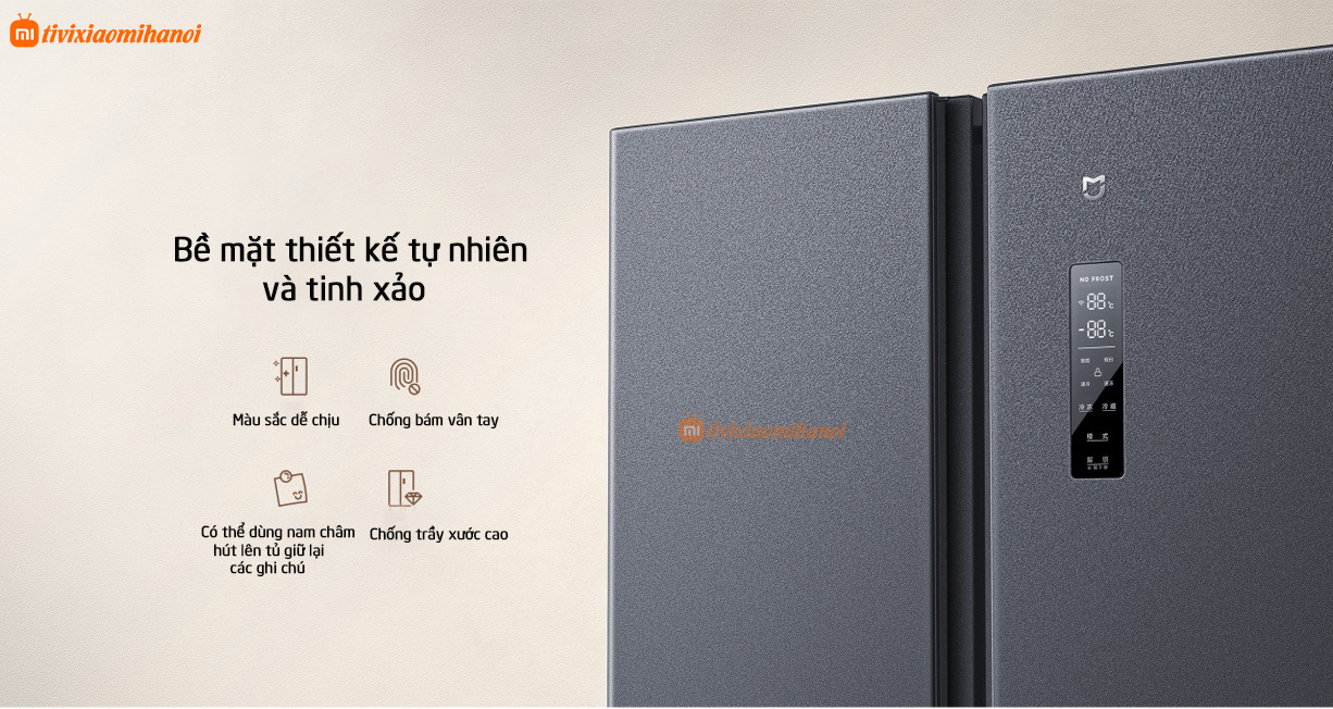Về ngoại hình, tủ lạnh Mijia 610L sử dụng tấm vân đá thô, công nghệ carbon ion nóng chảy và vật liệu thân cửa 9 lớp được đánh bóng tinh xảo, đảm bảo tính thẩm mỹ và độ bền không chê vào đâu được. Cảm giác chạm tinh tế và không dễ để lại dấu vân tay, bảng điều khiển có độ cứng cao và chống trầy xước, chất liệu kim loại tốt bền bỉ.