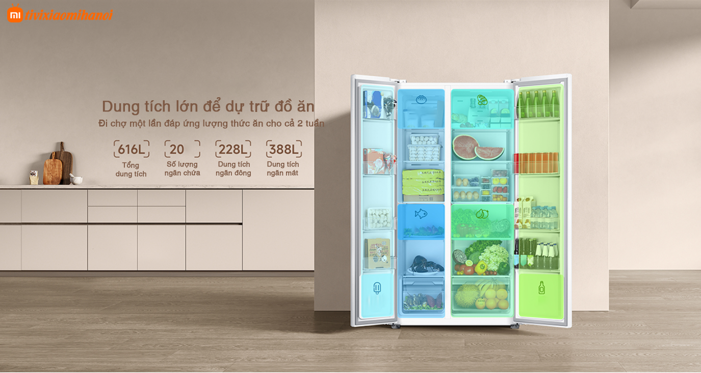 Tủ lạnh Xiaomi Mijia 616L có dung tích lớn lên tới 616L, đủ đáp ứng nhu cầu sử dụng hàng ngày của một gia đình. Trong đó, ngăn đông có dung tích 228L và ngăn lạnh có dung tích 388L, giúp bạn dễ dàng bảo quản nhiều nguyên liệu khác nhau. Vách ngăn lên tới 20 ngăn giúp cải thiện hơn nữa khả năng lưu trữ của tủ lạnh, giúp nguyên liệu của bạn ngăn nắp hơn.